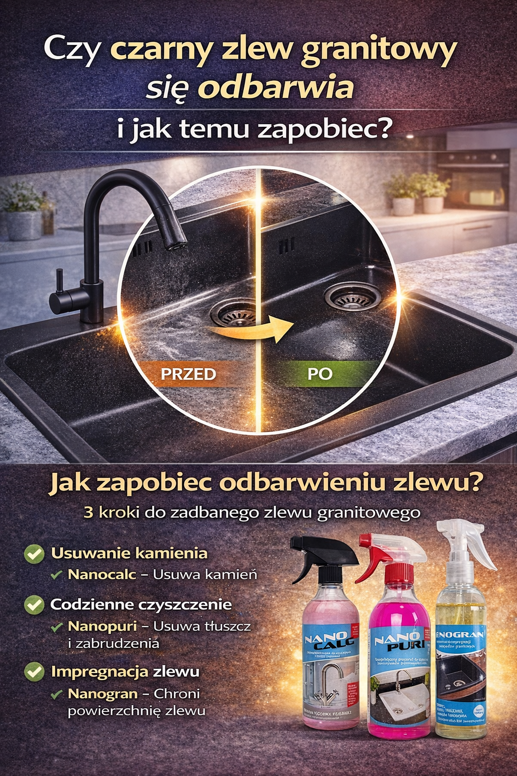 Zlewozmywaki granitowe są bardzo popularne w nowoczesnych kuchniach. Są trwałe, eleganckie i dostępne w wielu kolorach. Niestety nawet najlepszy zlew może z czasem pokryć się białym nalotem. To właśnie kamień z wody, który powstaje w wyniku osadzania się minerałów znajdujących się w twardej wodzie.