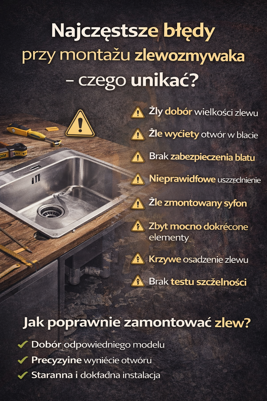 Montaż zlewozmywaka wydaje się prostą czynnością, ale w praktyce właśnie na tym etapie pojawia się wiele problemów. Niewłaściwie wycięty otwór w blacie, źle dobrany syfon, brak odpowiedniego uszczelnienia lub zbyt mocne dociągnięcie elementów montażowych mogą prowadzić do nieszczelności, uszkodzeń blatu albo skrócenia żywotności samego zlewu.