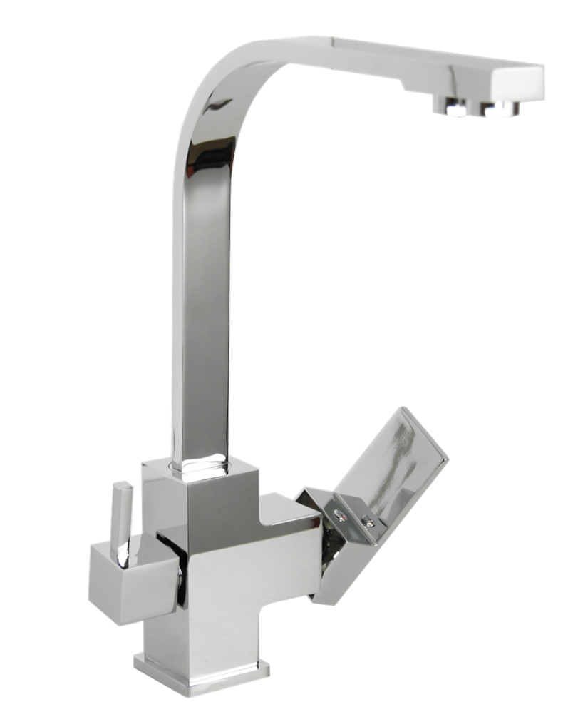 Nasza oferta obejmuje bardzo duży wybór eleganckich stojących baterii kuchennych znanych marek. Prezentowana bateria kuchenna do filtra wody FIL CHROM to produkt firmy Stellman. Jest to bateria stojąca wyposażona w obrotową wylewkę, co zdecydowanie ułatwia korzystanie z kranu. Na szczególną uwagę zasługuje tu nietuzinkowy design – zamiast powszechnie stosowanych okrągłych rurek, otrzymujemy baterię o spłaszczonym, nieco kanciastym wręcz kształcie.