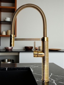 Bateria została wykonana z solidnego mosiądzu, dzięki czemu gwarantuje niezrównaną trwałość i długoletnią niezawodność. Złota powłoka w odcieniu szlachetnego połysku Gold przyciąga wzrok i doskonale podkreśla charakter każdej nowoczesnej lub klasycznie urządzonej kuchni. Wyróżniająca się geometryczna faktura korpusu nadaje jej ekskluzywnego, designerskiego wyglądu – to Królowa w świecie armatury.