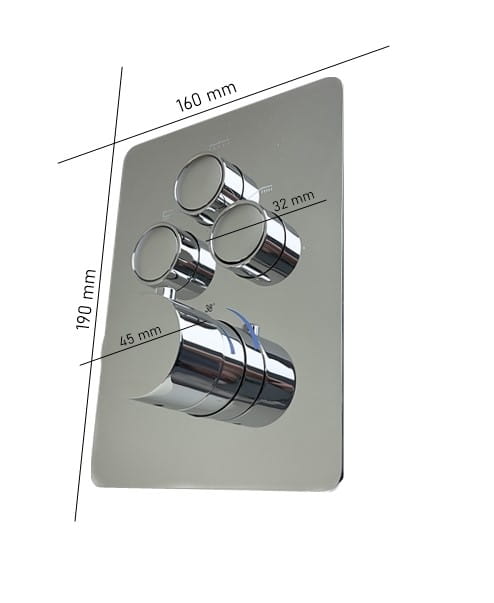 - Trójdrożny system przycisków – umożliwia niezależne sterowanie trzema źródłami wody (np. deszczownicą, wylewką, słuchawką prysznicową).