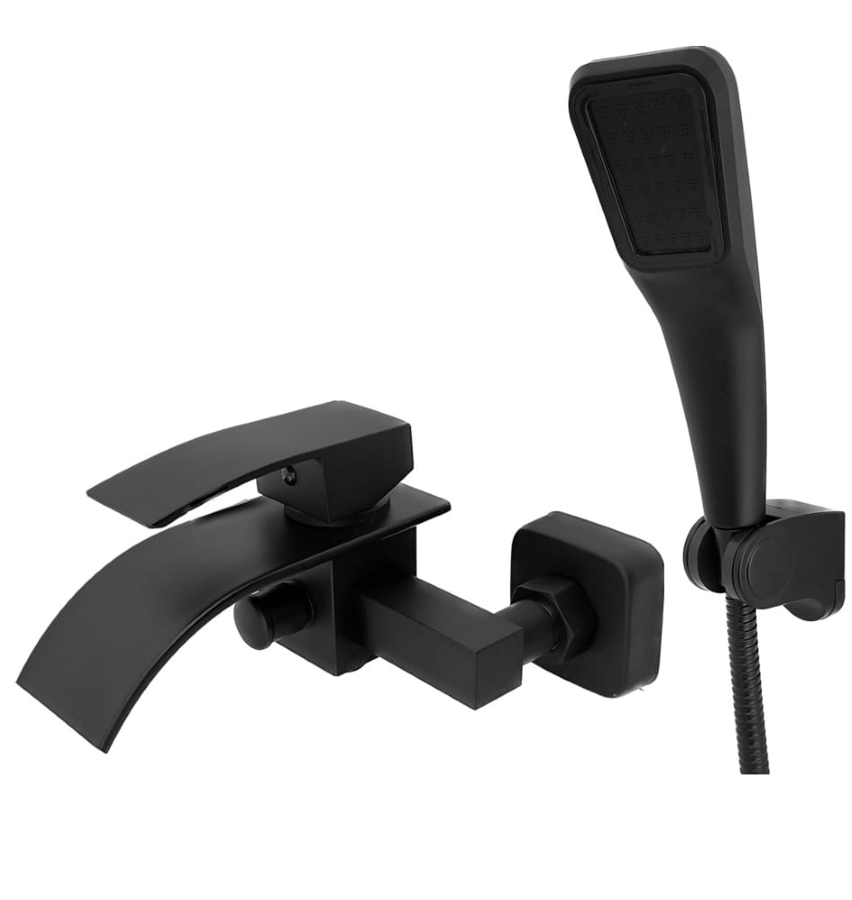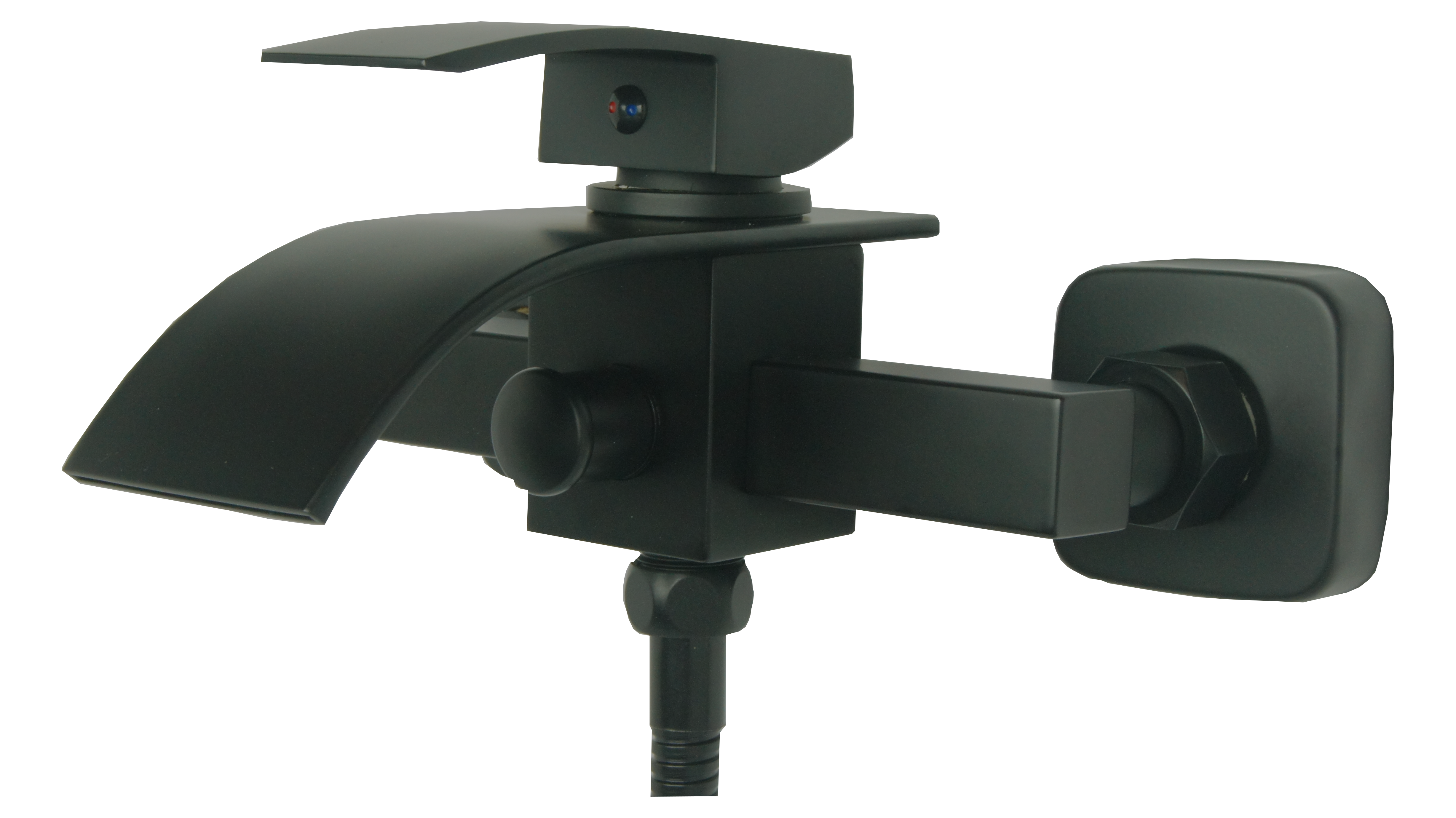 LUMO Bateria Wannowa z szerokim wypływek kaskadowym BLACK i słuchawką o niezwykle wydajnym strumieniu wody. Mikro otwory zapewniają delikatny i jednocześnie skuteczny strumień.