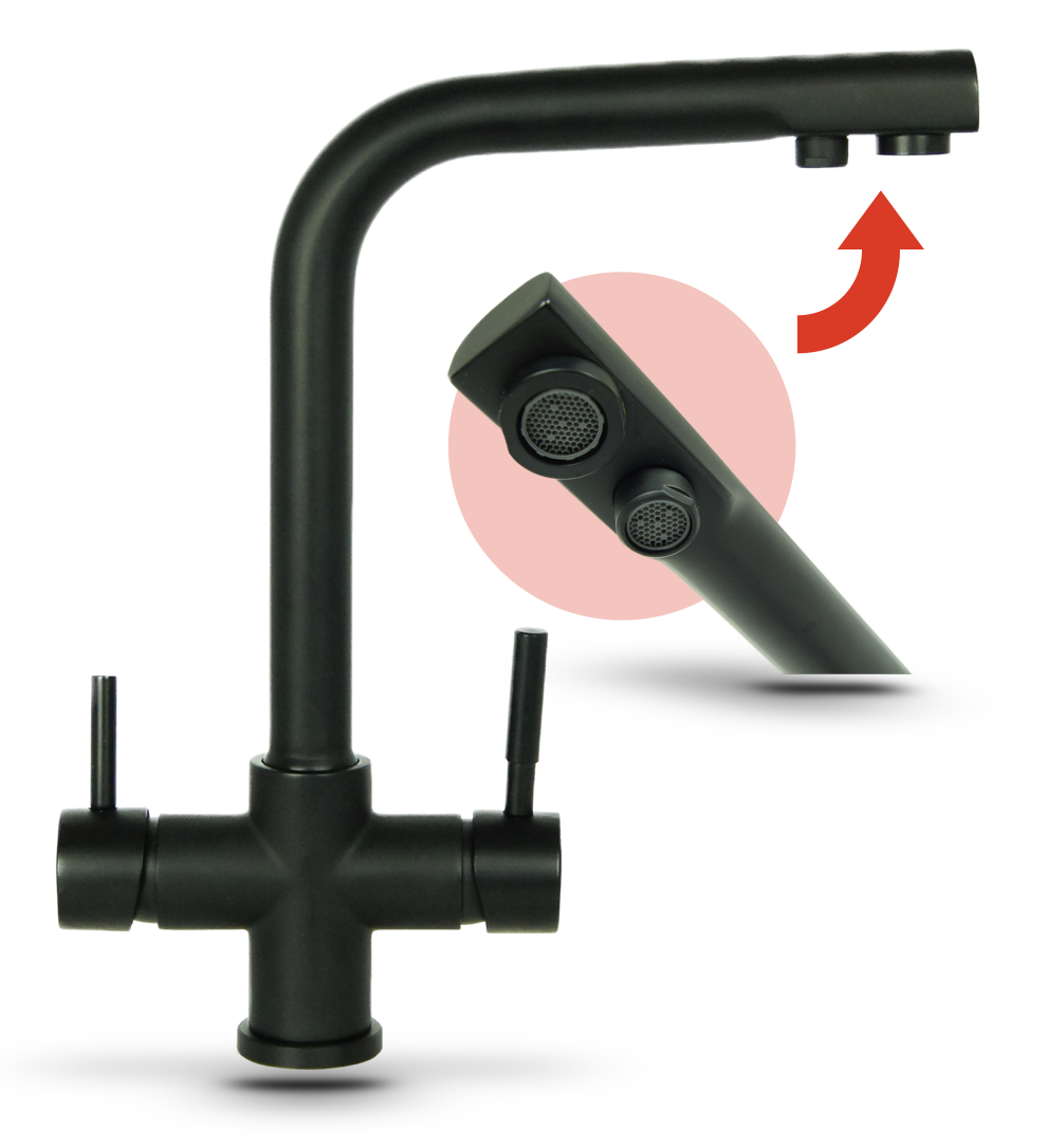 Czterodrożna bateria kuchenna z wylewką do wody filtrowanej i zmineralizowanej. Nowoczesna bateria kuchenna wysokiej jakości, posiadająca dwa perlatory. Możliwość zastosowania do każdego systemu odwróconej osmozy.