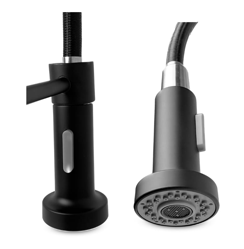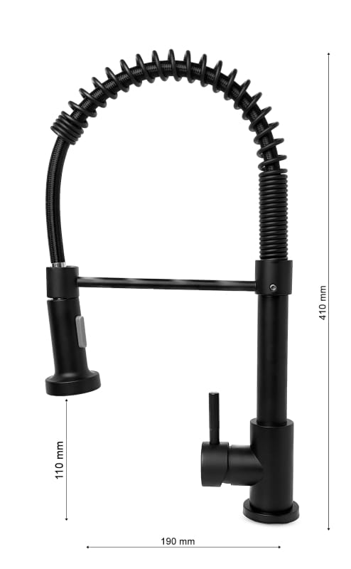 Bateria kuchenna SANTI w kolorze czarnym to funkcjonalne rozwiązanie do nowoczesnych kuchni. Uniwersalny, współczesny kolor komponuje się świetnie z ciemnymi zlewami i meblami. Bateria pozwala na swobodne obracanie wylewki, dzięki czemu nalewanie wody do naczyń staje się znacznie łatwiejsze. To wygodne rozwiązanie dla osób, które cenią sobie możliwość manewrowania wężem i docierania nim w najtrudniej dostępne przestrzenie.