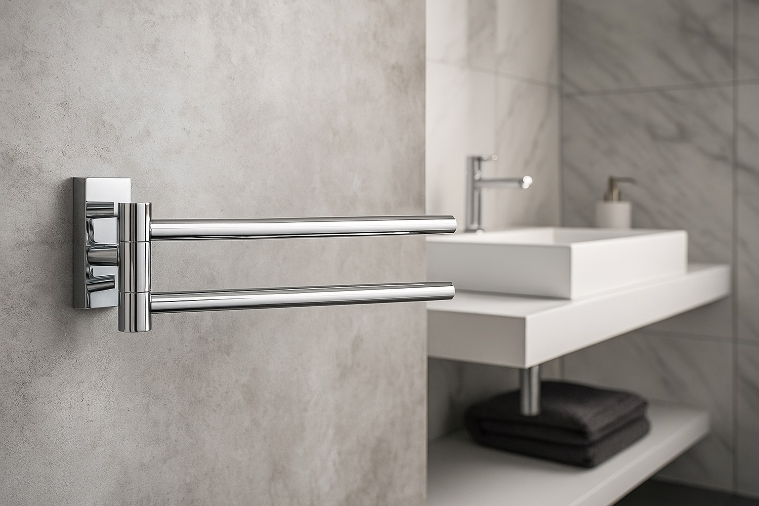 Podwójny, obrotowy wieszak na ręczniki ARGIO to idealne rozwiązanie dla każdej łazienki, w której liczy się nowoczesny styl oraz praktyczne wykorzystanie przestrzeni. Wykonany z wysokiej jakości metalu i wykończony w chromie o lustrzanym połysku, znakomicie komponuje się z armaturą STELLMAN® i innymi akcesoriami łazienkowymi.