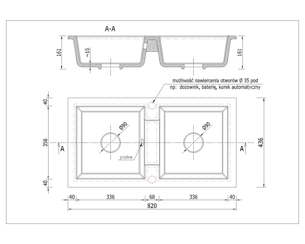 • zlewozmywak posiada 3 pod frezowane Ø 35 (gotowe do samodzielnego dowiercenia otwornicą do gresu)