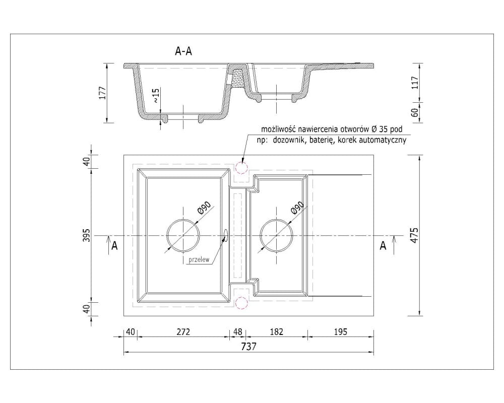 • zlewozmywak posiada 2 pod frezowane Ø 35 (gotowe do samodzielnego dowiercenia otwornicą do gresu)