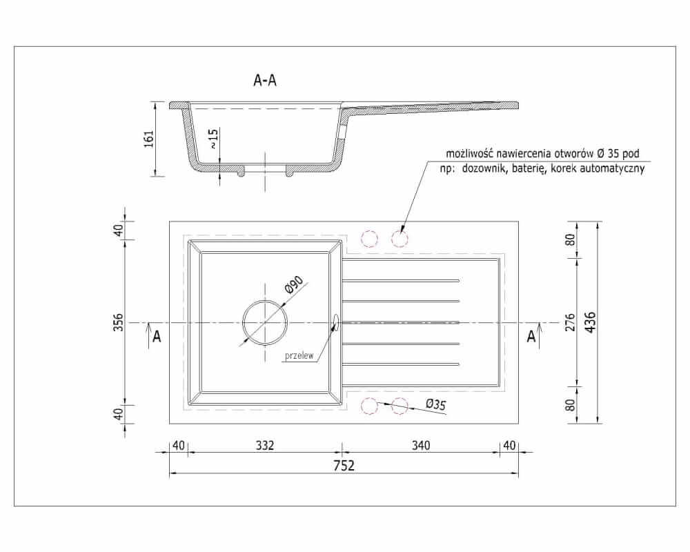 - zlewozmywak posiada 4 pod frezowane Ø 35 (gotowe do samodzielnego dowiercenia otwornicą do gresu)