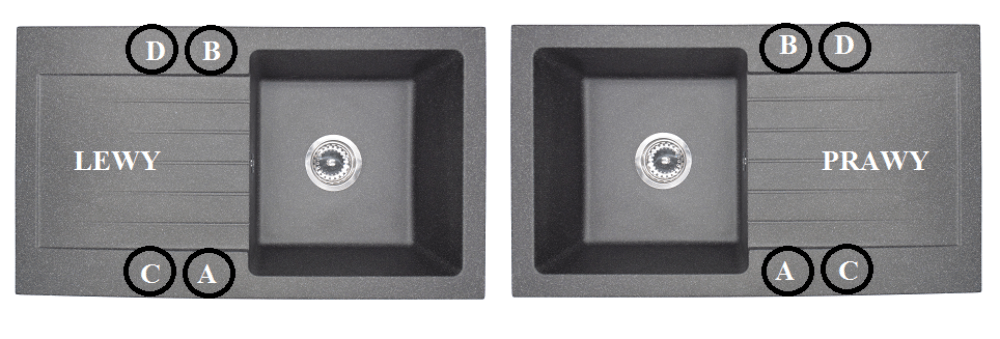 W przypadku nie podania opcji montażu, wysyłamy zlew z dwoma standardowymi otworami A, B.