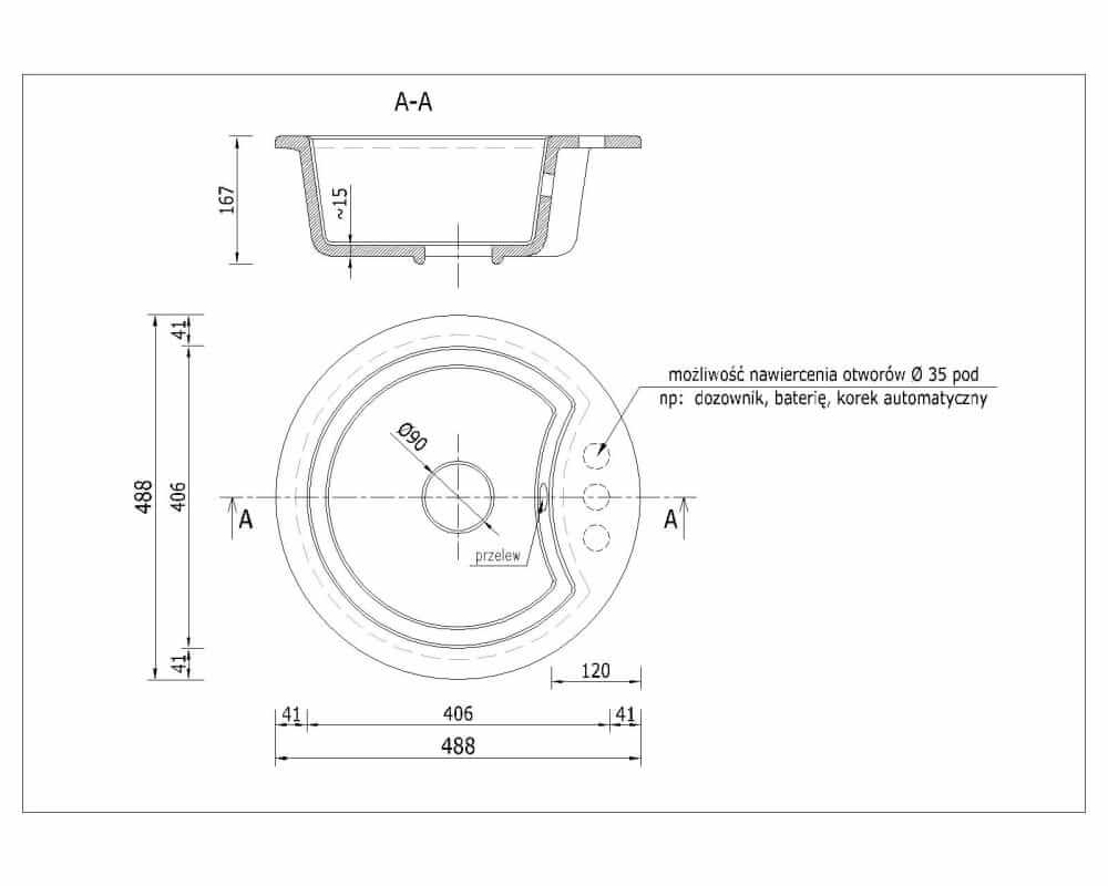- zlewozmywak posiada 3 pod frezowane Ø 35 (gotowe do samodzielnego dowiercenia otwornicą do gresu)