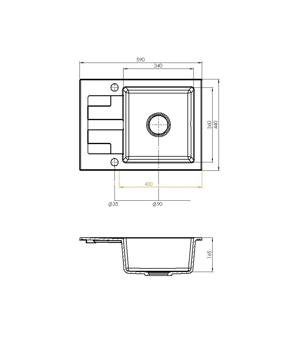 Wymiary zlewozmywaka: 59 cm (szerokość) × 44 cm (głębokość)