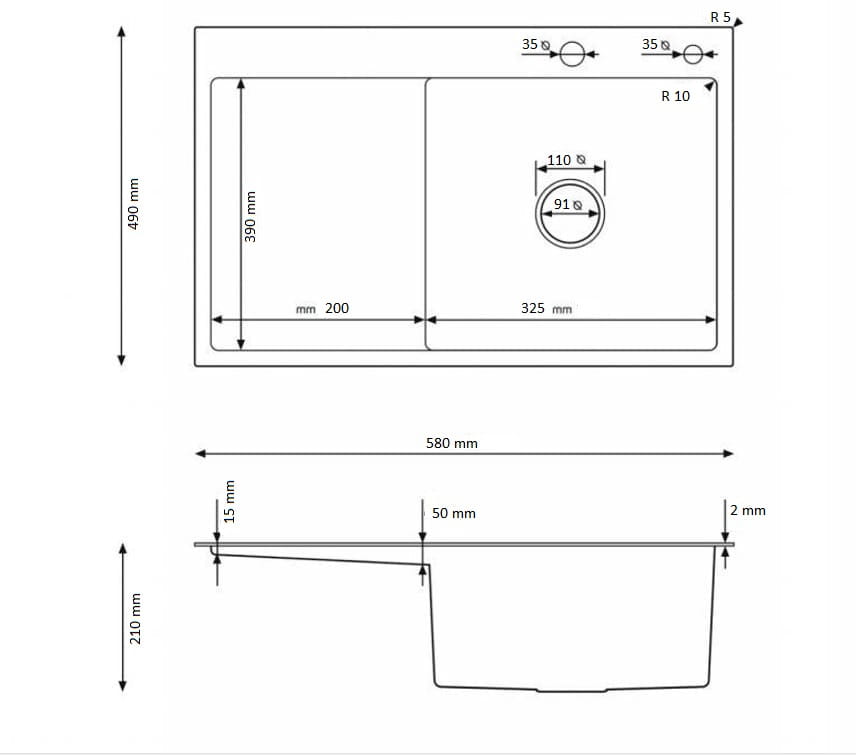 ▫ Wysoka trwałość – stal nierdzewna o grubości 0,8 mm + warstwa wygłuszająca; górna krawędź o grubości 2,2 mm.