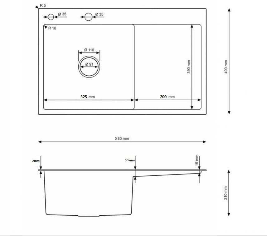 ▫ Wysoka trwałość – stal nierdzewna o grubości 0,8 mm + warstwa wygłuszająca; górna krawędź o grubości 2,2 mm.
